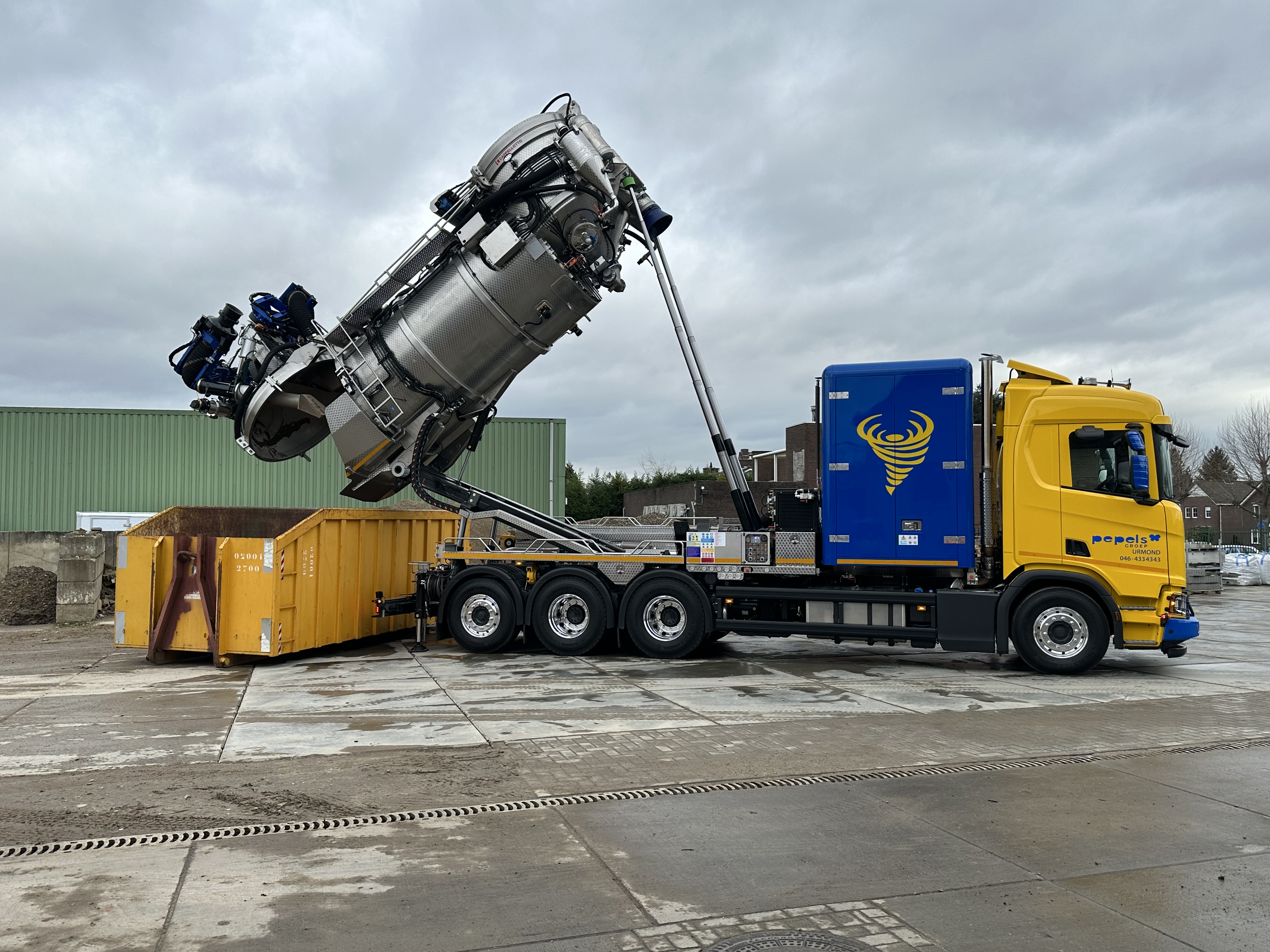 We hebben maar liefst twee jaar op deze machine gewacht. De opbouw is afkomstig uit Italië en van het merk Cappellotto. Wij hebben gekozen voor deze vacuümmachine omdat wij op zoek waren naar een oplossing voor het zuigen van natte en plakkerige materialen op langere afstanden. Deze machine is daar uitermate geschikt voor en kan afstanden overbruggen van 100 meter horizontaal. Bij Cappellotto was er ook de mogelijkheid om als extra optie een blaasmodule te monteren op deze machine. Daarmee kunnen wij dus ook droge en korrelige materialen zoals zand en grind blazen. Om deze alleskunner helemaal optimaal inzetbaar te krijgen is er ook gekozen voor hydrostatische rijaandrijving en een hoogkiepende uitvoering wat resulteert in een kieshoogte van maar liefst 2,5 meter!!!